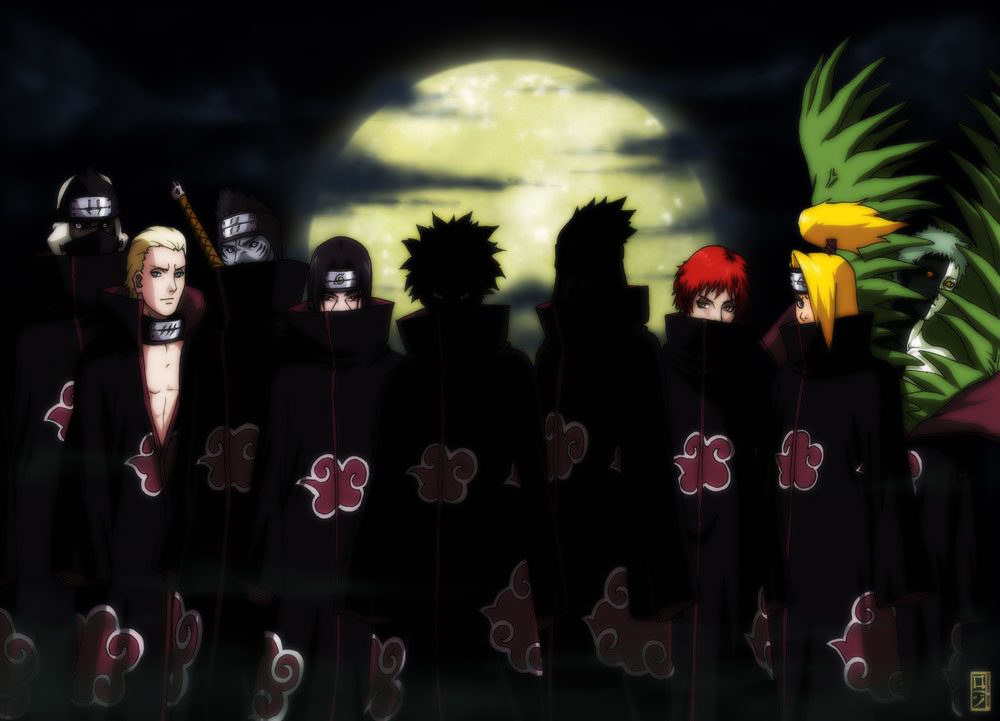 Akatsuki: meaning "Dawn," or "Daybreak" is a criminal organization, whose role in the series is to capture the jinch riki (tailed beasts inside great ninjas). It is extremely influential due to its elite membership. The admission criteria are extraordinary fighting ability and deadly ruthlessness. In order to join the Akatsuki one must prove himself to be a strong fighter, but also to sever his previous connection to his past relations. We see Uchiha Itachi's slaughtering of his clan to become a member of this group. Akatsuki's members wear special rings and village headbands with a strike line across the village symbol on the plate.